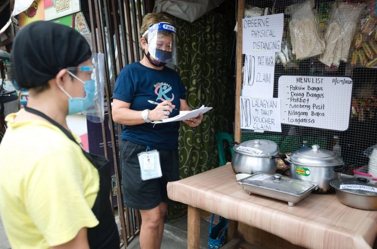 A health cadet trained through Project Karinderya helps ensure that karinderya operators observe standards on food preparation, food safety, and customer service in Quezon City. Project Karinderya is a two-in-one program that helps both karinderya owners whose operations were disrupted by the COVID-19 pandemic and families in urban poor communities through meal subsidies.