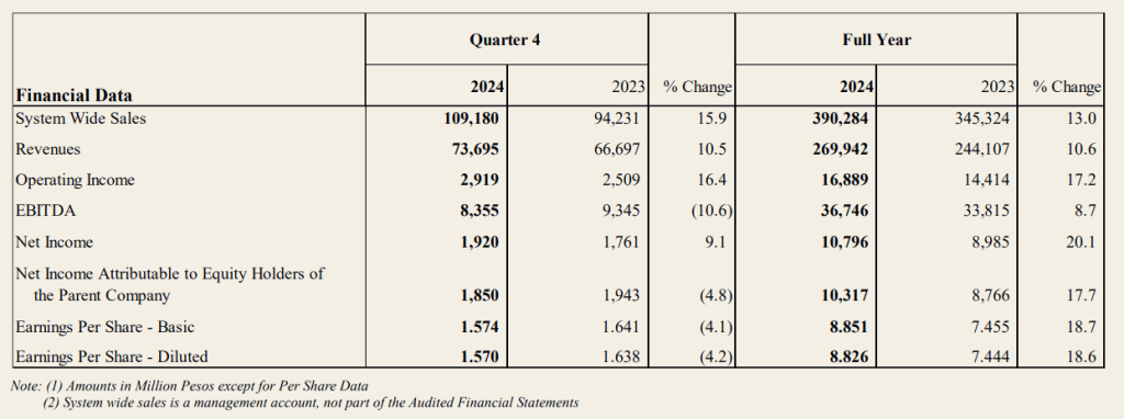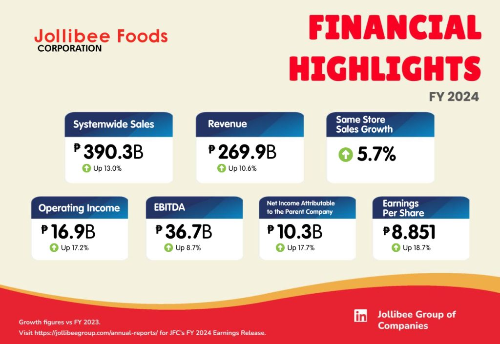Jollibee Foods Corporation (JFC, also known as Jollibee Group), one of the largest Asian food service companies, today reported its financial results of operations for the fourth quarter (Unaudited) and full year ended December 31, 2024, based on its Audited Consolidated Financial Statements.